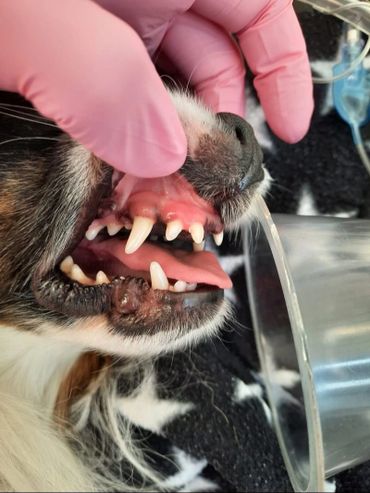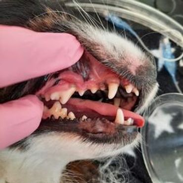 Ohessa kuva Rockysta, jolla ahkerasta kotihoidosta ja vähäisestä plakin ja hammaskiven määrästä huolimatta parodontiitti on aiheuttanut usean hampaan poiston.
