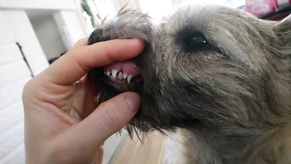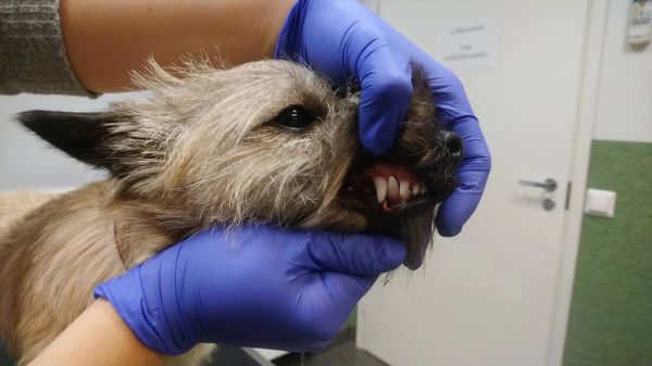 Kuvissa cairnterrieripentu, jolla todettiin lievää linguoversiota jo pentutarkastuksessa. Purentaa seurattiin tarkoin ja ensin poistettiin alamaitokulmahampaat pysyvien puhjetessa kielen puolelle ahtauttaen purentaa entisestään. Tämä ei kuitenkaan riittänyt: pysyvä alakulmahammas ei siltikään mahtunut oikealle paikalleen yläkulmahampaan eteen, johtuen yläkulmahampaan asennosta. Tämän vuoksi myös ylämaitokulmahampaat poistettiin ja kotioikomishoitoa jatkettiin niin ala- kuin yläkulmahampaiden osalta, sekä sormien avulla tehtävällä oikomisella että pallojumpalla. Viimeisessä kuvassa oikomishoidosta on kulunut noin kuukausi. Haavat ovat parantuneet hienosti ja kotioikominen tuottanut toivottavaa tulosta, purenta on normaali.